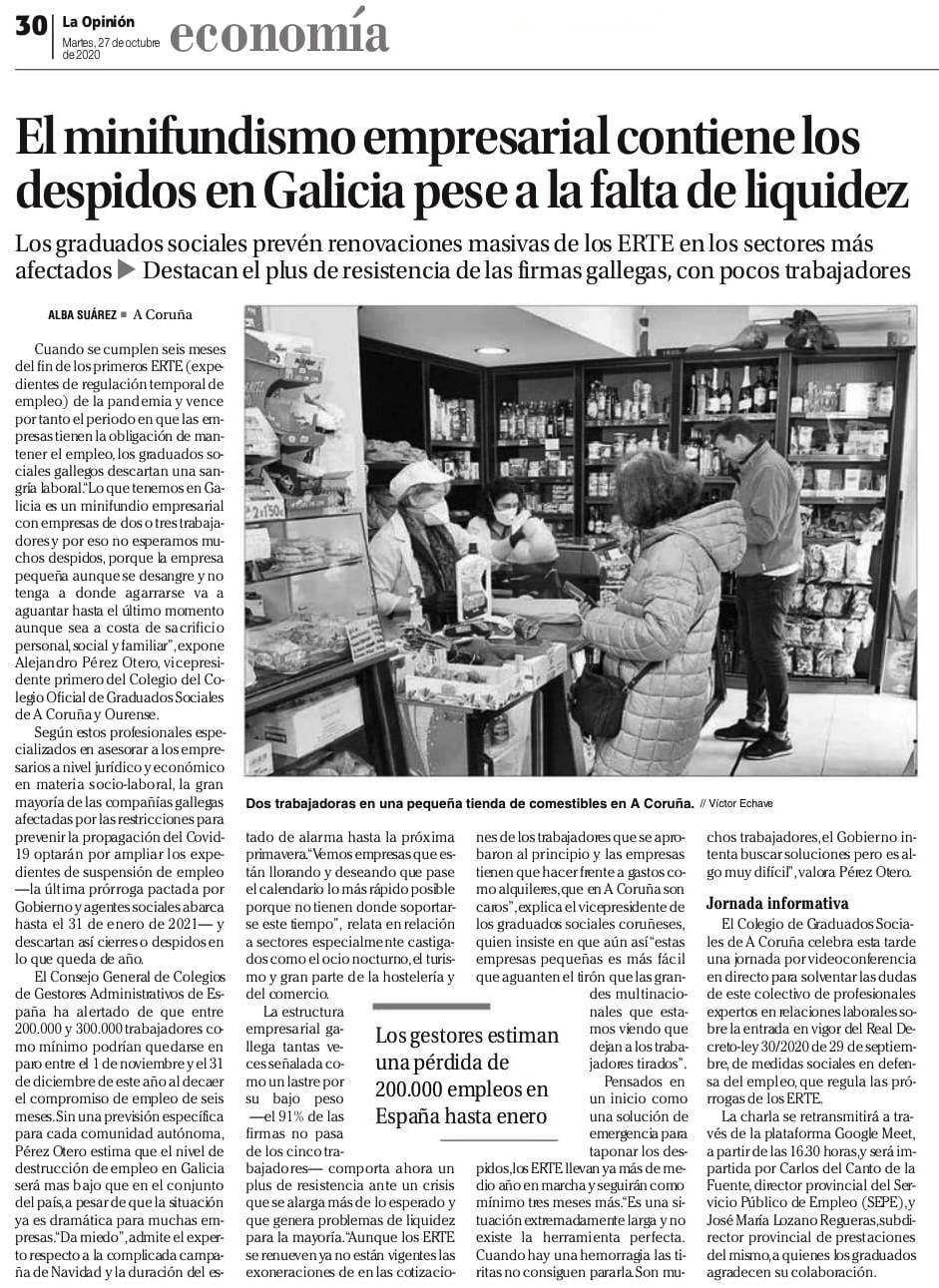 Nota de prensa, onde o Vicepresidente 1º e Secretario Xeral da nosa Corporación, D. Alejandro Pérez Otero, fai unha valoración do estado actual dos Ertes xerados pola pandemia, unha vez que nos aproximamos ao vencemento da obrigatoriedade das empresas de manter o emprego. (Diario "La Opinión" – 27 de outubro de 2020).